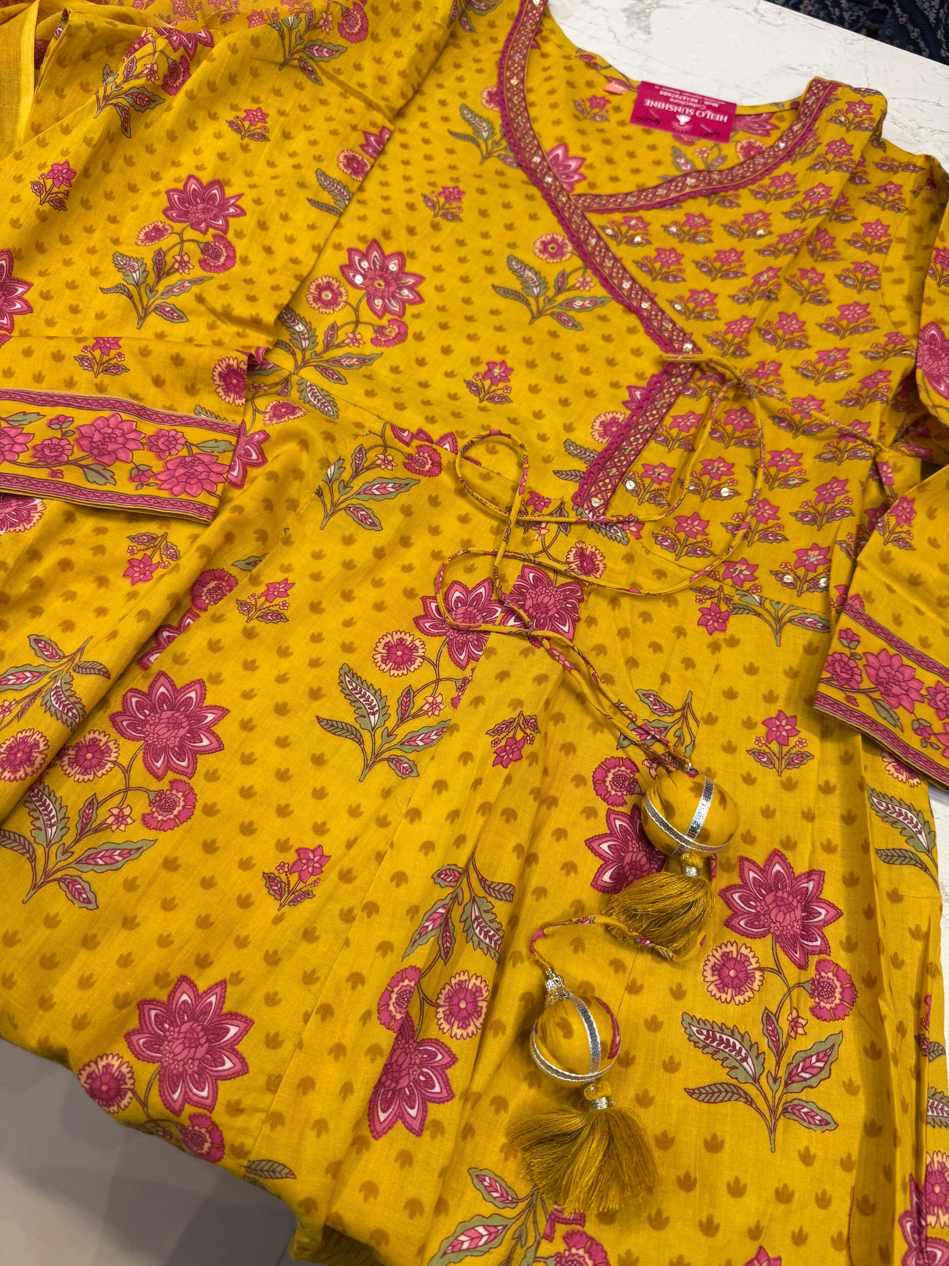 Anarkali Yellow with Pink Pure Cotton Kurti With Pant and Dupatta