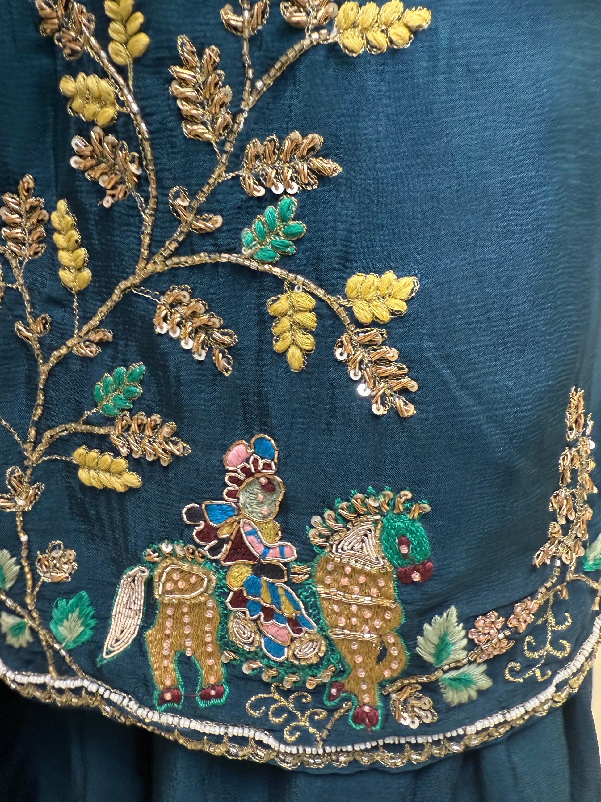 Blue Hand Embroidery Pure Chinnon Sharara Set