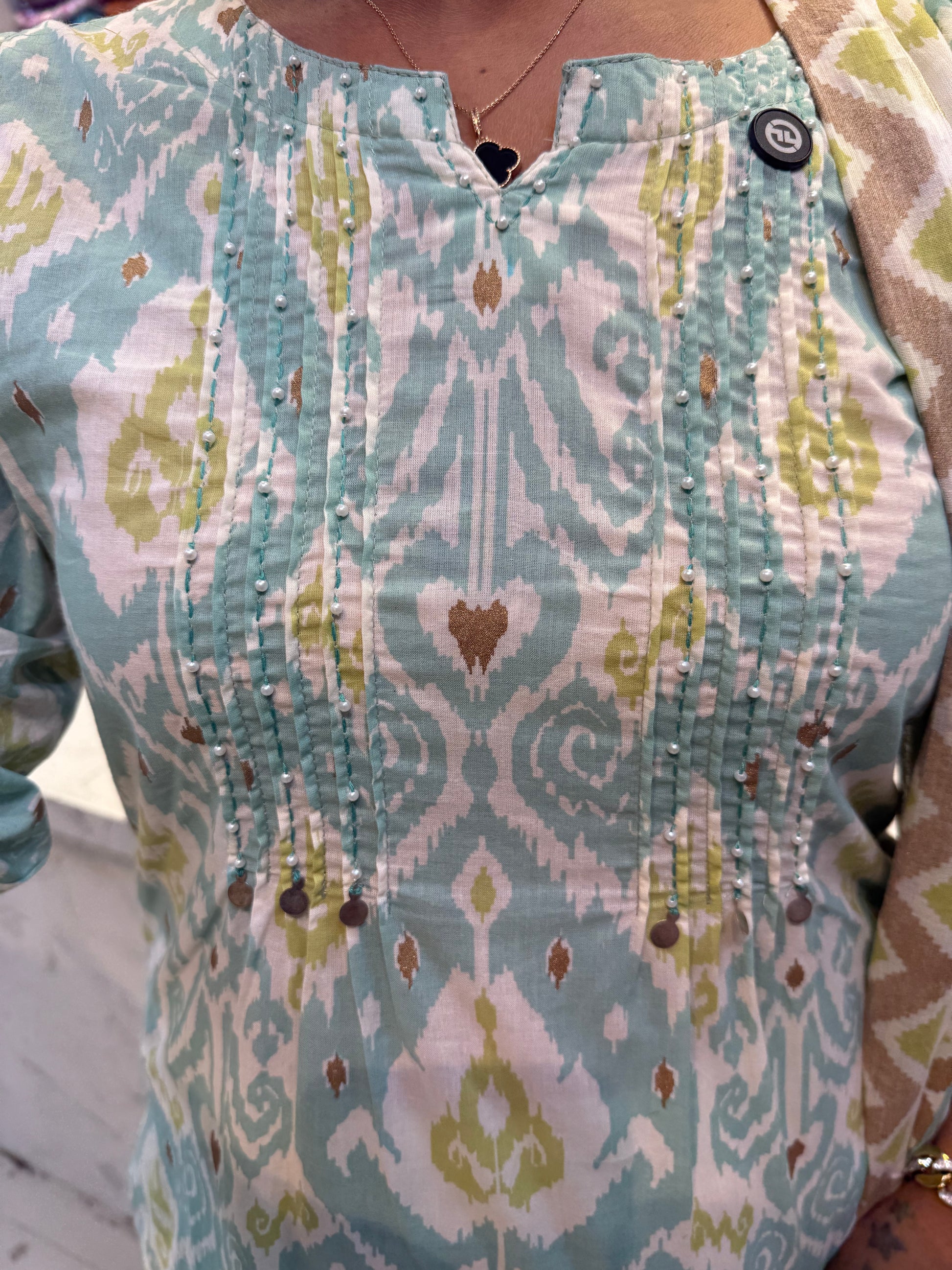 This cotton salwar set features delicate lace detailing, combining comfort with elegant design. Crafted from breathable cotton fabric, it ensures all-day wearability while the lace accents add a refined touch, making it suitable for both casual and semi-formal occasions. Ideal for those seeking a blend of traditional style and modern comfort.