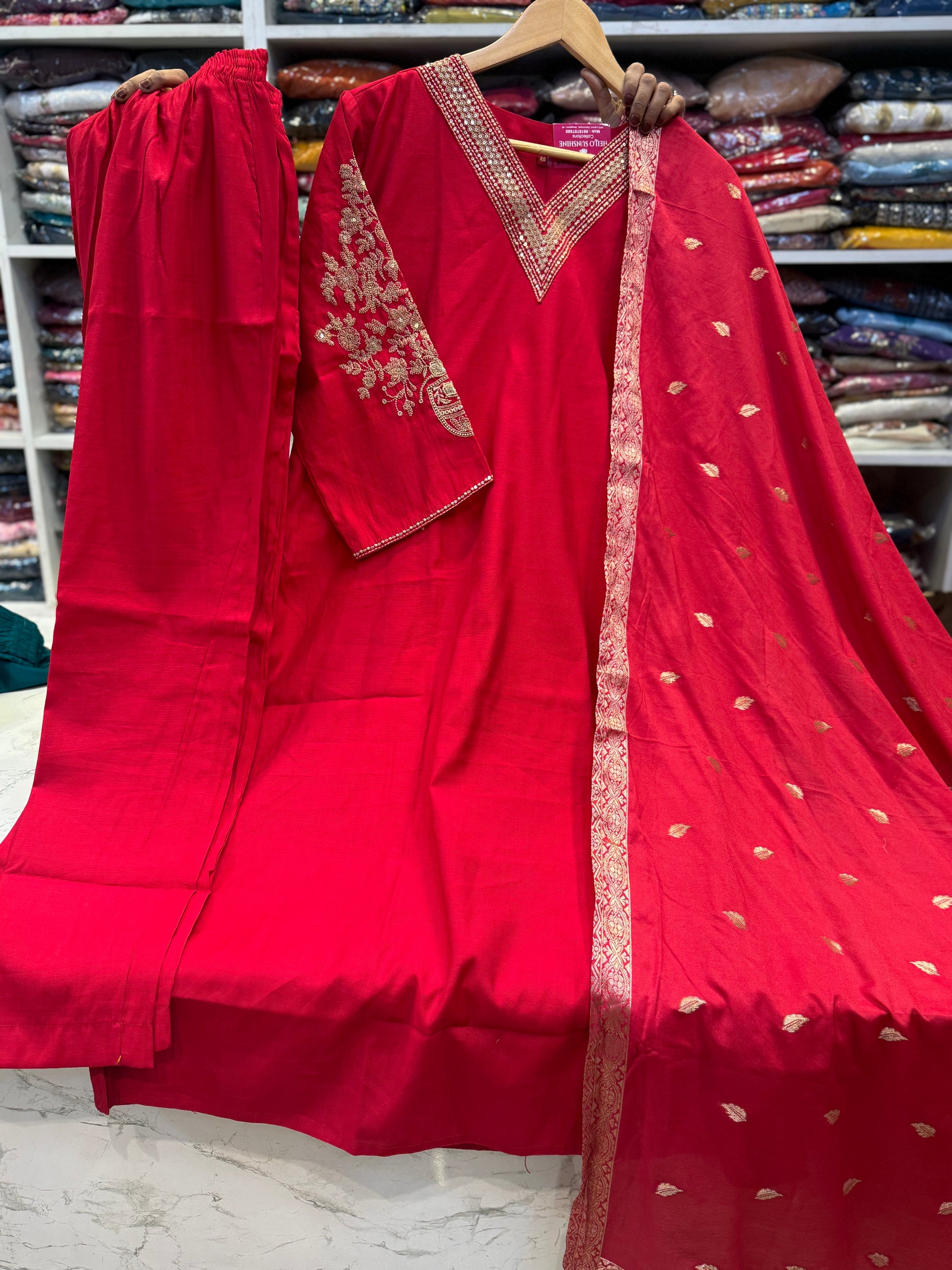 Red Roman Silk Kurti With pant and Dupatta