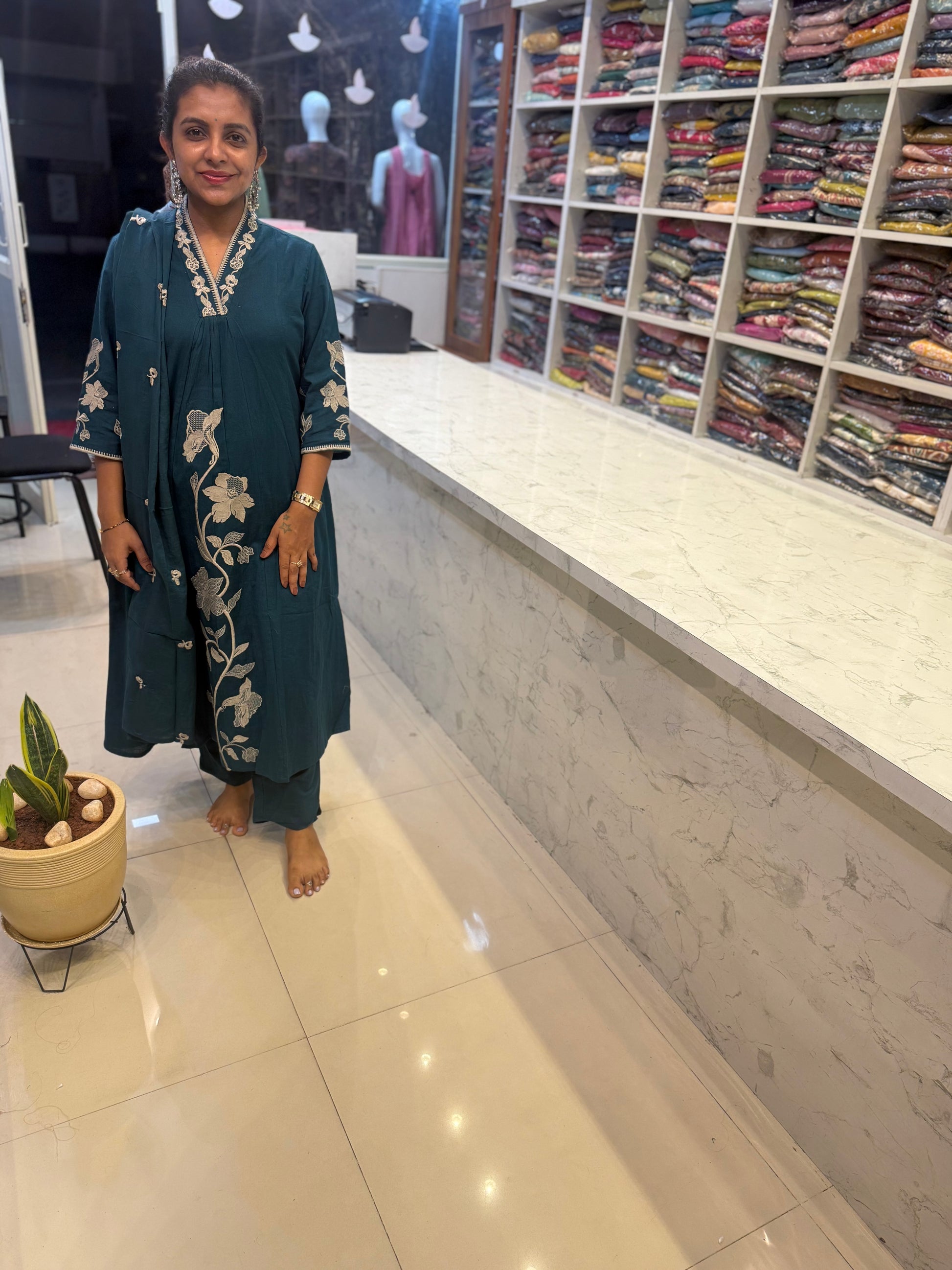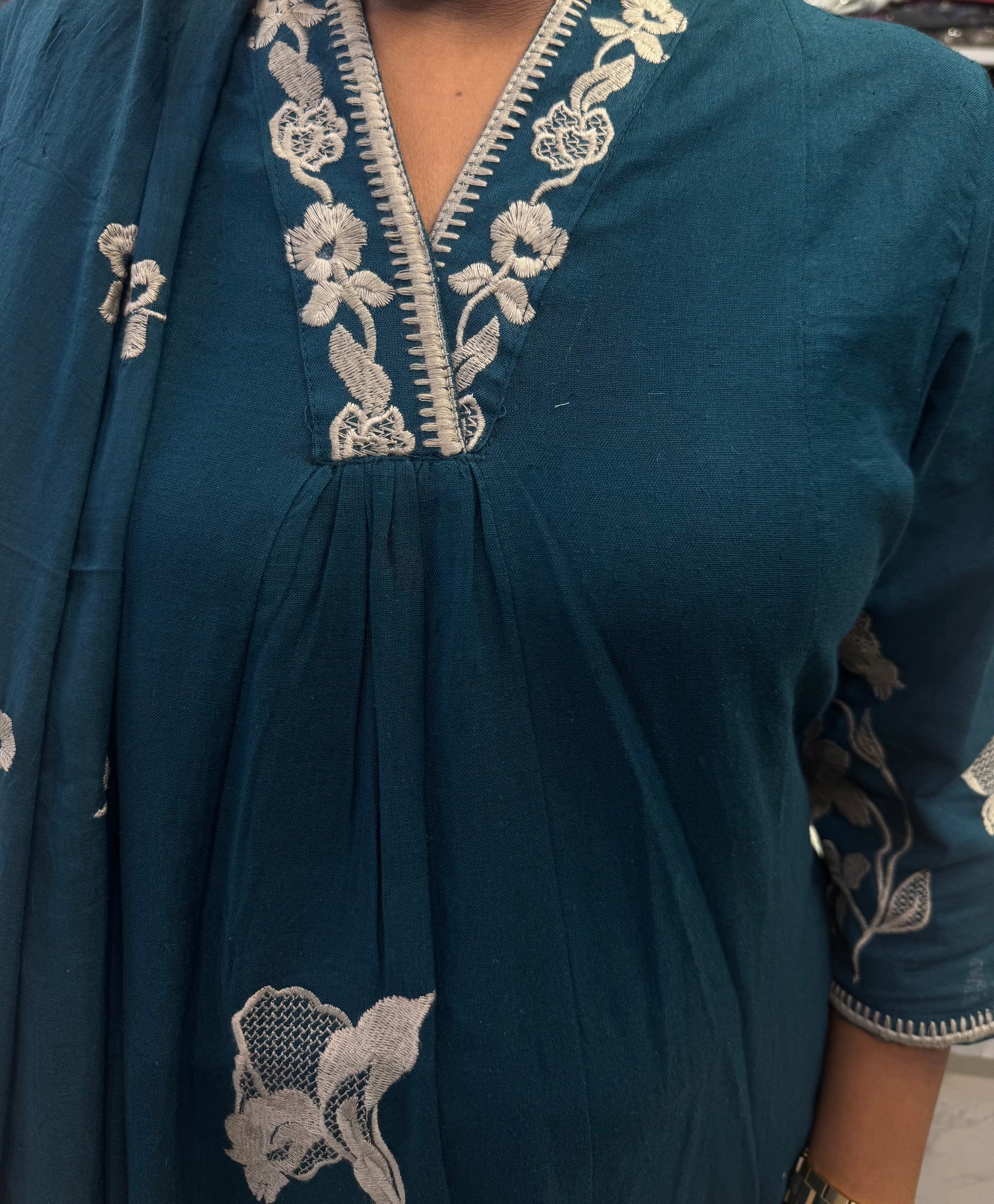 Teal Blue Cotton Flex Kurti With Pant and Dupatta