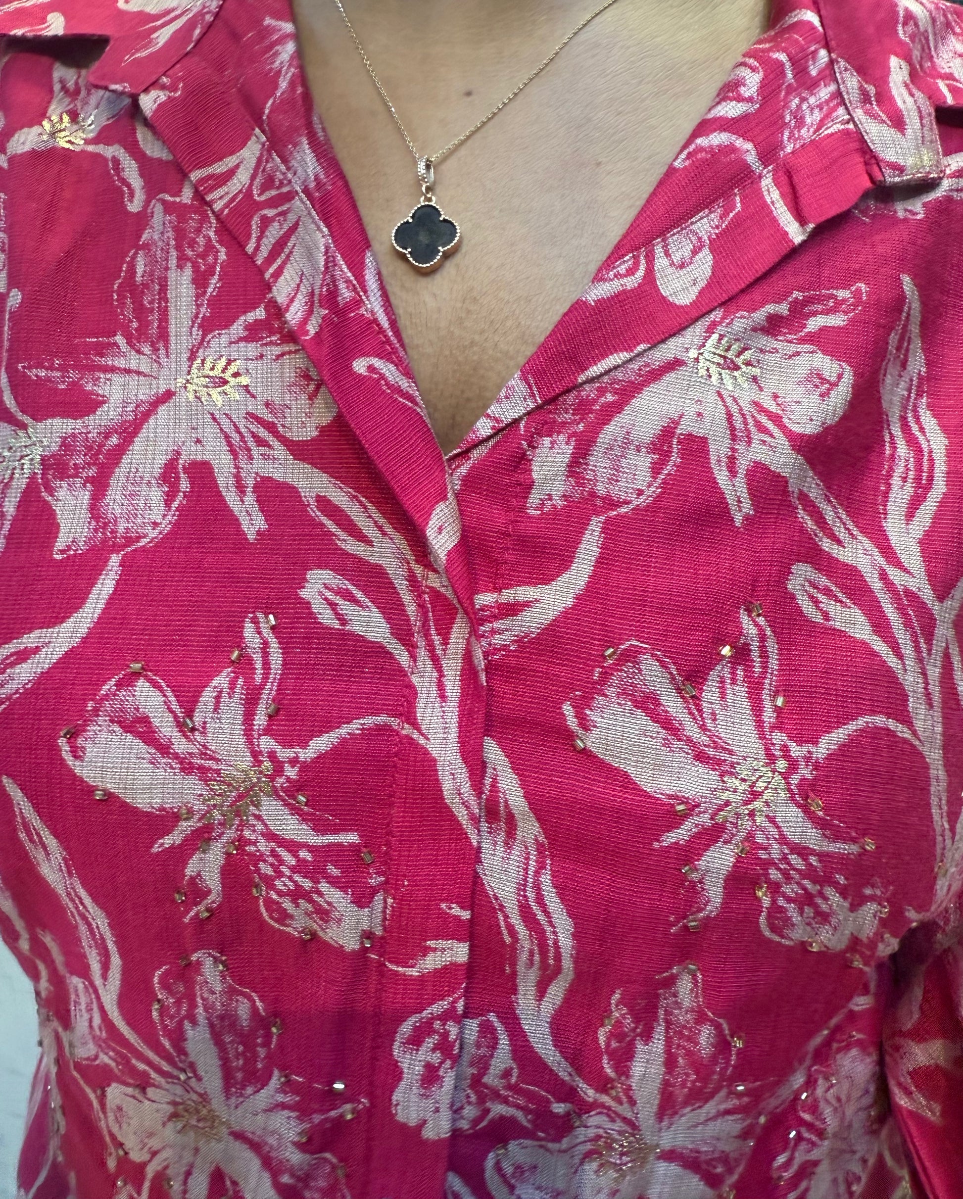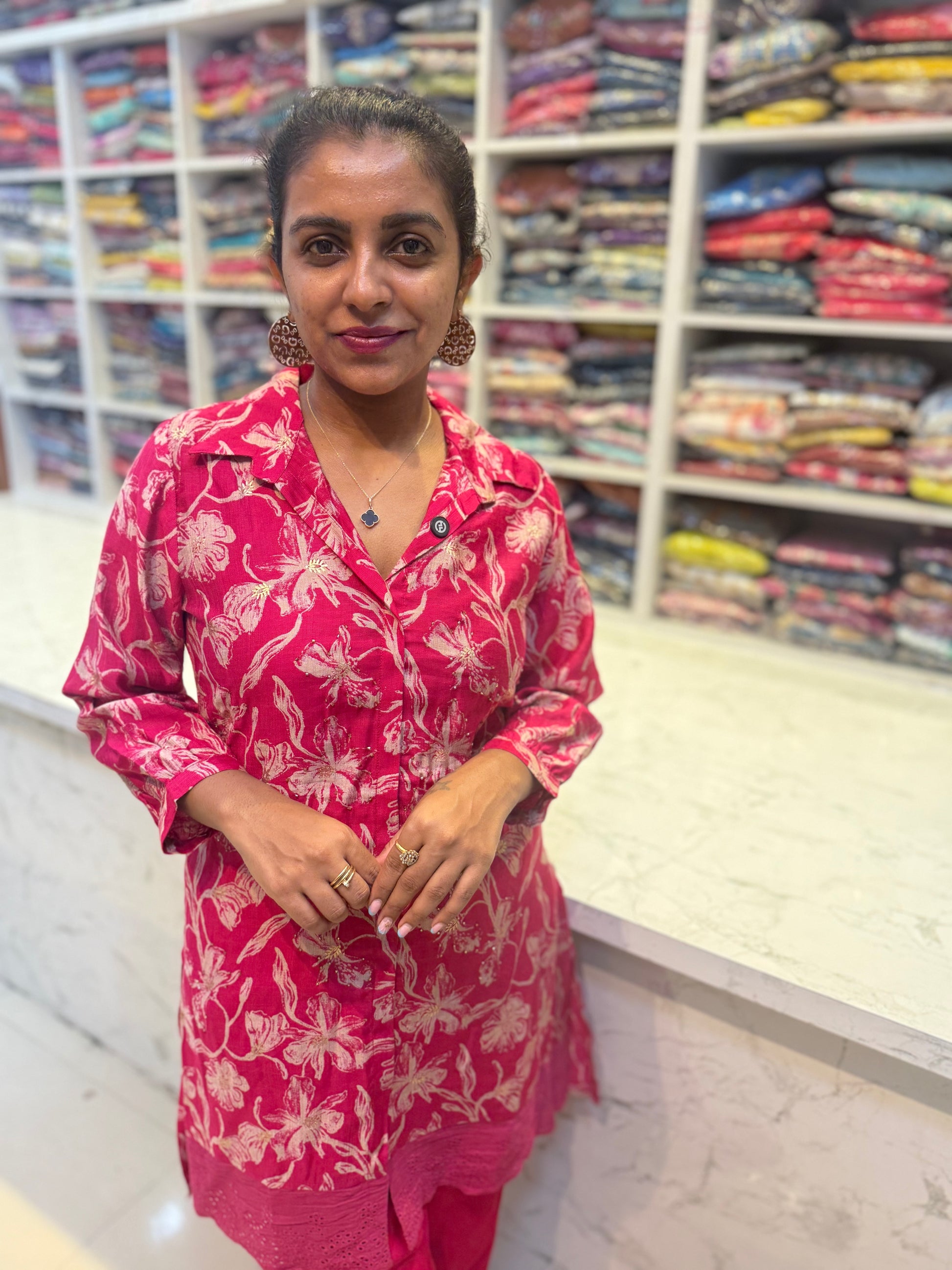 if you are looking for casual outing co-ords check this amazing rani pink Co-ords with collar neck with amazing lace detailing